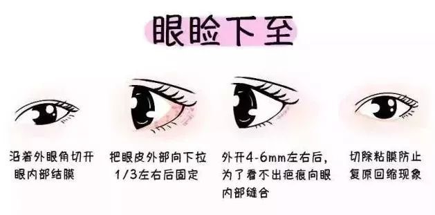 手术从结膜入路,切除下睑的睑板下缘,然后缝合。这样眼睛就睁得大了。配合开眼角和上睑提肌缩短,眼睛自然会比以前大很多。