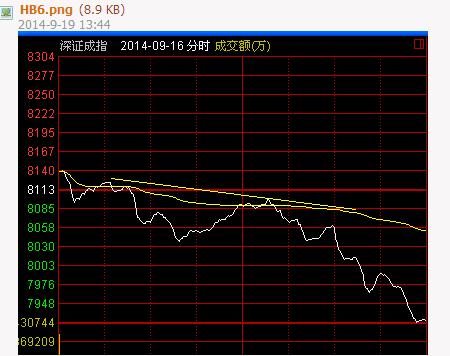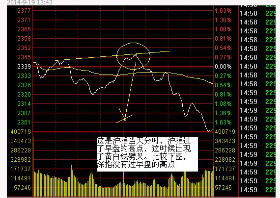 第三,也是最重要一点。出现的位置和性质决定之后跳水的大小。比如说,出现在一波上涨的末期,那么黄白线的出现很可能就是下跌的开始。有些人看到黄白线劈叉后一连大跌多天,甚至形成几个月的顶部。哇塞,这招真厉害啊。本人感觉这种想法不对。黄白线劈叉的技术本身只能看出来分时的一波跳水,而之后形成顶部后大跌是其他因素的配合,别都搞到他身上去。再比如,一波刚刚启动的行情中,黄白线的跳水就可能就是一波分时急跌。所以,在正好要买或者准备卖的时候起到的作用最大。什么时候黄白线的意义大?咱们这里还是举例来讲。初段图HB2中,一个白线快速向上而黄线向下的小劈叉动作,但当日收出了中阴。我们来看看下面两个图。图HB3和图HB4。其中HB3是2014年9月16日附近沪指的日K线(黄圈中是2014年9月16),图HB4是深指同步日线。比较一下不难看出,沪指在之前明显强于深指数。中阴当天沪指已经创出新高,而黄白线劈叉就出现在冲击新高的后期。而深指,不但K线上比沪指弱了很多,当日分时也没超过当天高点。图HB5和图HB6是2014年9月16日沪指和深指的分时。就是说2014年9月16日当天,沪指新高后深指没有新高而出现的黄白线劈叉,这时候是最容易引发形成当日高点而下跌的。像这震荡横盘中沪指新高,而深指没新高的情况下,即使没有黄白线劈叉,哪怕是白线快速拉升了,也该注意......