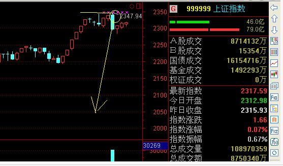 注意黄白劈叉最明显的标志是白线向上的同是黄线向下。我们可以想一下,代表权重股的白线快速向上的同是黄线已经向下了。接下来白线涨不动了,那就是黄线和白线一齐下跌。会形成分时一波急跌。