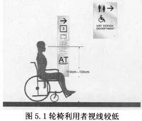 信息和交流的无障碍要求:公共传媒应使听力言语和视力残疾者能够无障碍地获得信息,进行交流,如影视作品、电视节目的字幕和解说,电视手语,盲人有声读物等。但是,迄今为止,无障碍设计的对象主要是轮椅利用者,对于视觉障碍者来说,关爱仍然显得不足。但是在建筑规划的过程中如果对各类残疾人都采取个别措施对待,就有可能产生新的图5.1轮椅利用者视线较低