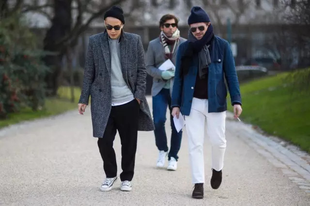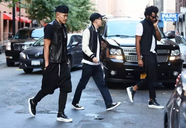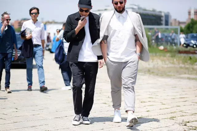 帆布鞋,就与整体黑白风格的高街风相得益彰了。我们可以发现