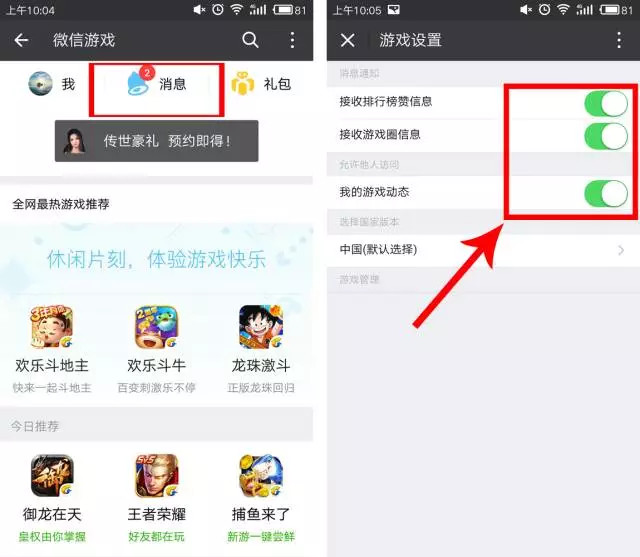 发现—游戏—点击右上角的「设置」图标—游戏管理—然后分别将「接收排行榜赞消息」以及「接收游戏圈消息」关闭即可。