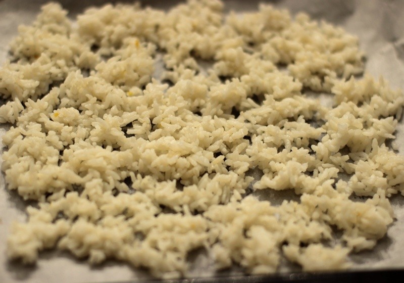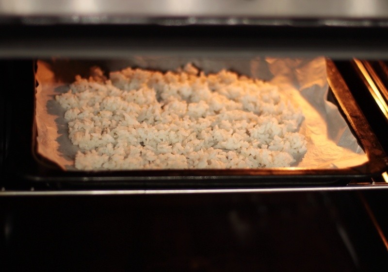 1、直接将剩米饭均匀铺到放好油纸的烤盘里。
