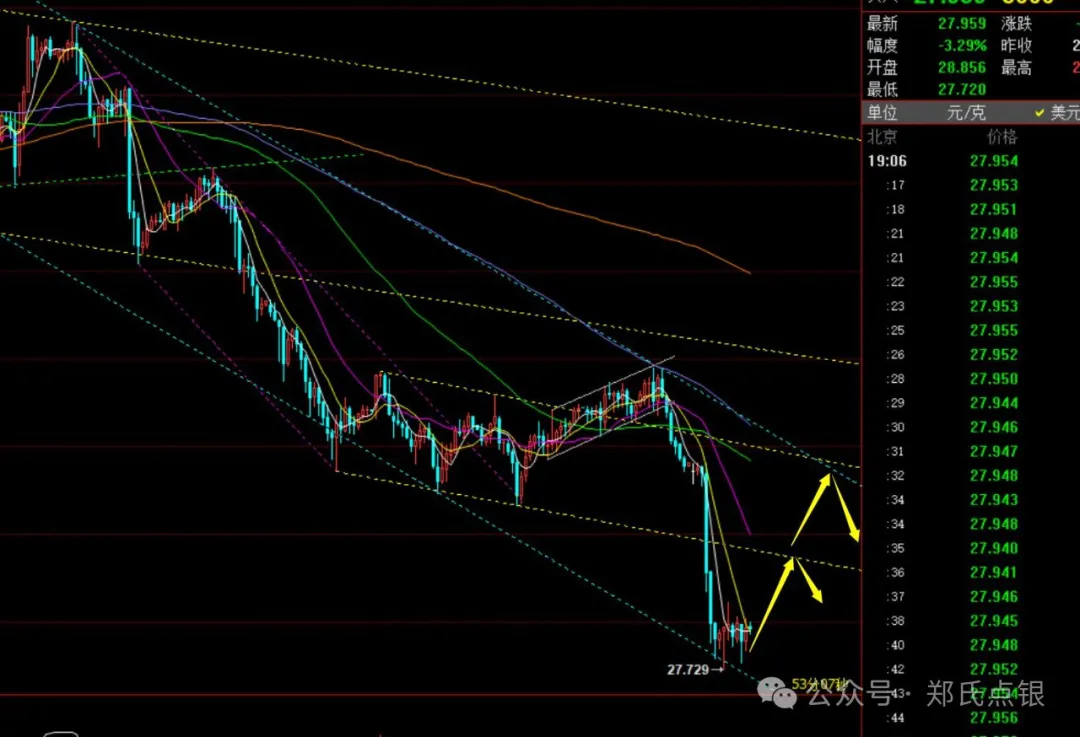 第二,白银方面: 黄金昨晚走势反弹上涨力度比预期偏大,预期是2424下该承压了,结果高了8美金;但白银给的看跌阻力29.43丝毫不差,就是最高点附近,今日直接跌至27.7低点,这一波拿住的话,直接相当于黄金的85美金,折中下,抓个40美金问题不大,非常的干脆;