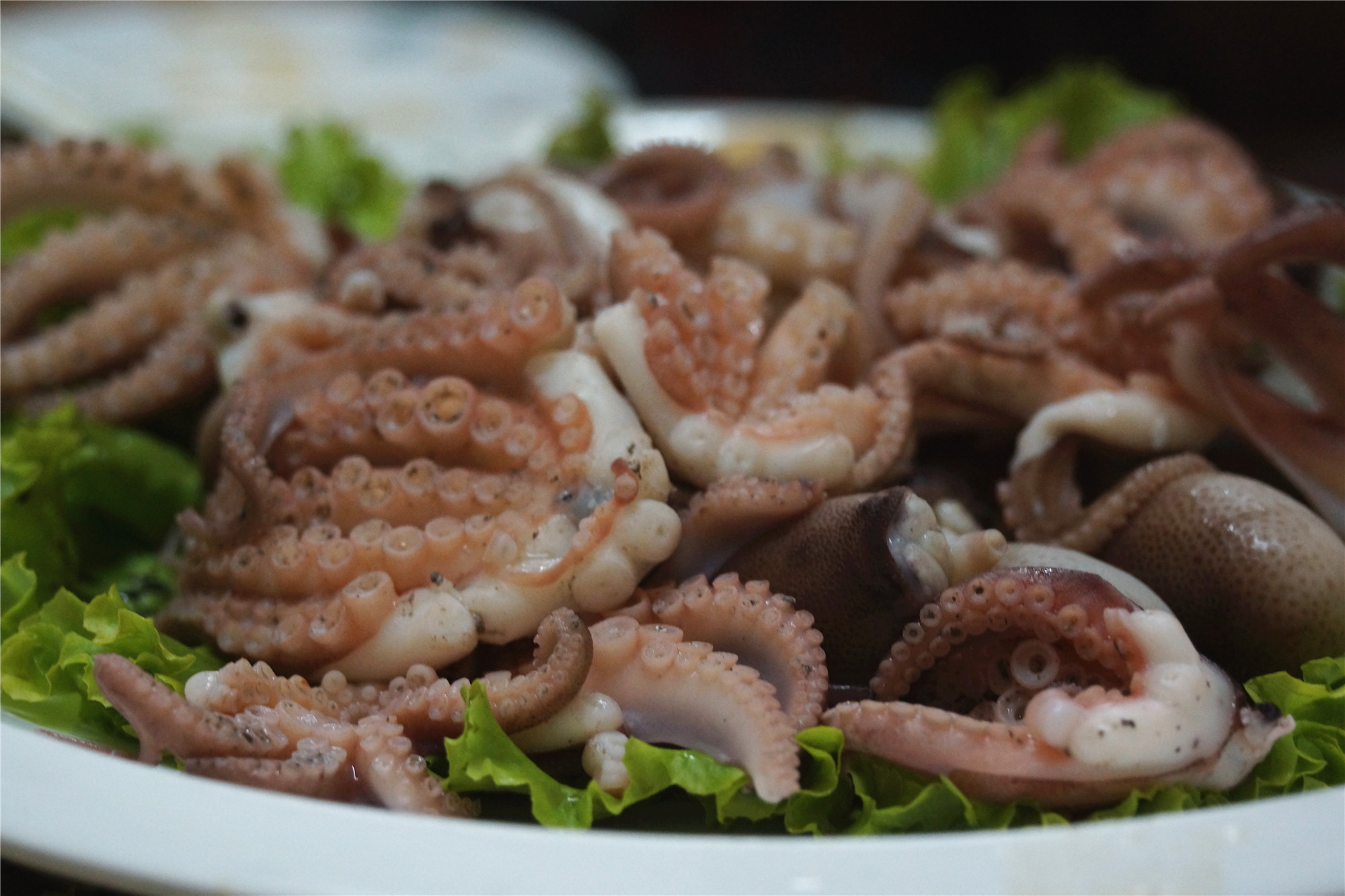 又一个超赞的菜,白灼小墨斗。活蹦乱跳的墨斗鱼不用说多新鲜了!这个蘸着辣根吃。最好吃的是那个墨斗——咬在嘴里,那一口墨汁,别提多香了!我们一桌都成了大黑嘴。