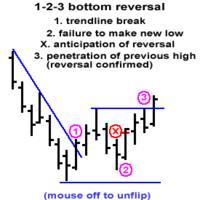 趋势反转之123法则和2B法则 2020-03-14 14:23阅读: http://blog.sina.cn/dpool/blog/u/3205184744 一、123法则: 首先要正确画出上涨或下跌趋势线,然后: 1 绘制正确的趋势线被突破; 2 上升趋势不再创新高或下降趋势不再创新低; 3 在上升趋势中,价格向下穿越先前的短期回档低点;在下降趋势中,价格向上穿越先前的短期反弹的高点。——3是趋势反转的确认! 如果仅发生两种情况,则代表可能的趋势变动。如果上述三种情况同时发生,则是对趋势变动的确认。 趋势变化的123法则相当于道氏理论对趋势发生变化的定义。 需要注意的是,有时候价格会出现短暂的假突破(新高或新低),但很快会回到前高以下或前低以上,因此还可以和2B法则相结合。