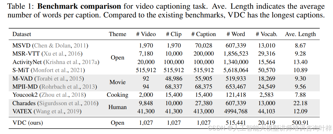 的平均描述长度显著高于其他现有基准测试,详细描述的平均长度超过 500 个单词。这使得 VDC