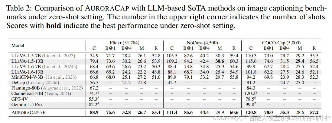 AURORACAP 在多个广泛使用的基准测试中表现出色。例如,在 表 2 中,AURORACAP 在 Flickr30k