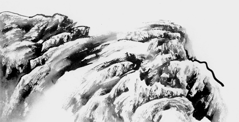 应艺术表现之需要,也可在生纸上作拖泥带水皴。要点在于处理好浓墨、淡墨及清水间的关系和变化。其间的接合无法用晕扫的方式,故只能趁湿碰撞接合。可先淡后浓,亦可先浓后淡。当重墨施足之后,为了浓淡过渡自然,不要再蘸重墨。当笔运行到一定程度时,笔锋会因水分渐干而难以为继,但余墨尚存,则可用笔尖汲取少量清水继续行笔。当笔墨行至原来清水的皴擦处,两者便会自然地接合、渗透。这时,生纸上就会出现润泽而多变的笔墨痕迹。(6)