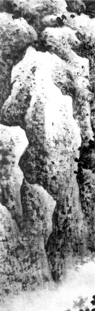 (一)雨淋墙头皴(见图一),明曹昭在《格古要论》称之为“泼墨矾头”,是纵向大斧劈皴的一个变种。其特点是“浓湿墨、大笔触”。采用此皴法表现山石时,笔锋要偃侧,自上而下挥扫,趁湿再用水笔向下接,行 |