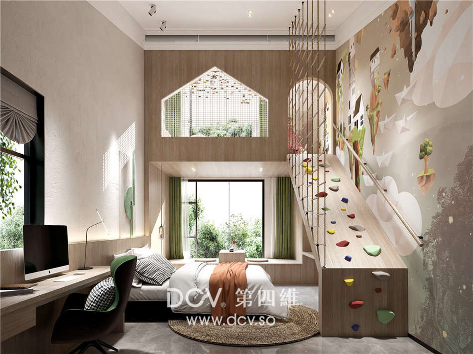 考虑到房子的多样化用途和使用者的多元化体验,让我们萌生了把“攀岩走壁、冒险磨炼”等元素加入其中,由此衍生出“孩童天地”系列。一个“家”,一家人,一个流连忘返的“家”......