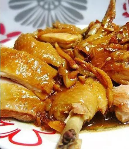 加入蒜米和姜丝,再焖煮2分钟,把鸡肉斩块,锅内酱汁倒在鸡肉上即可。