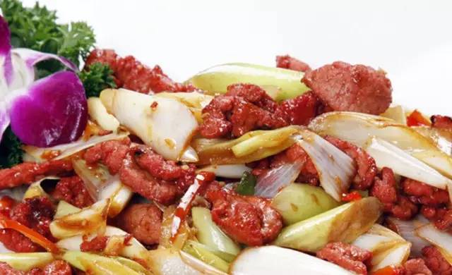 4、炒锅置上火,放入油,加入洋葱炒香,加入黑胡椒,盐,鸡精调味,投入牛肉片,翻锅炒匀,起锅装入盘中即可。