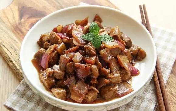 3、烧热锅,加油,待油热后加入洋葱翻炒。洋葱软后加入牛肉翻炒,然后加入土豆块一同翻炒。